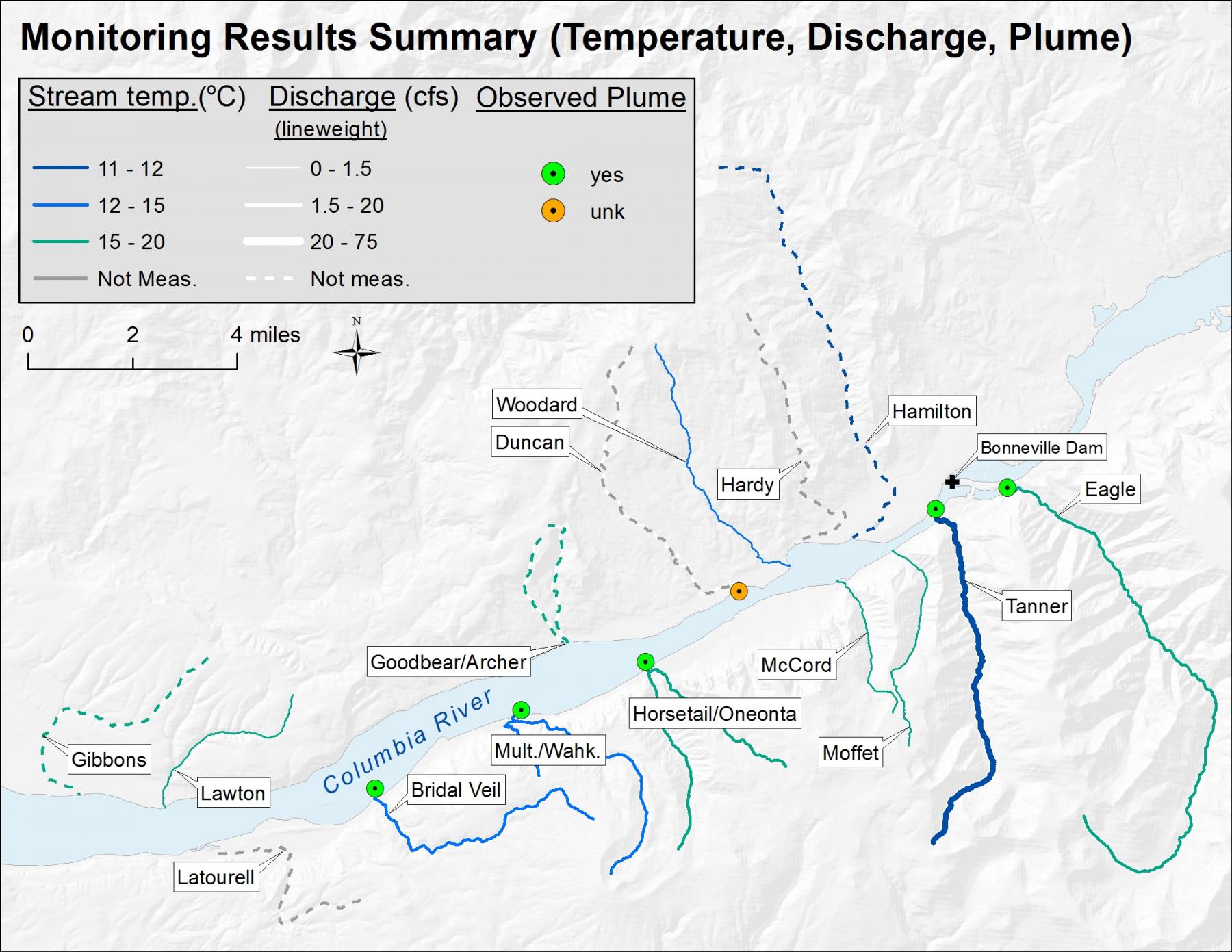 In summer 2015 and 2016, we assessed and mapped cold water inputs to the lower Columbia, including tributaries, springs, and groundwater seeps. We found a 57-mile gap of suitable cold water refuge between the Lewis River and Eagle Creek. While there are tributaries in this gap that supply cold water, due to their smaller flows and topography, their plumes are immediately diluted as they enter the mainstem.